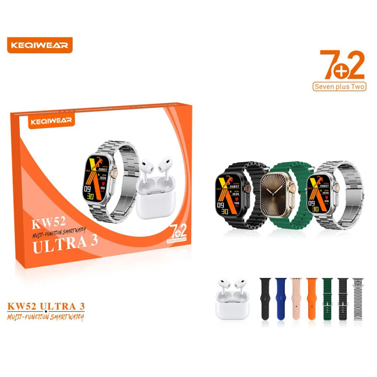 ساعت هوشمند KEQIWEAR مدل KW52 Ultra3 با بند استیل و سیلیکونی به همراه ایرپاد